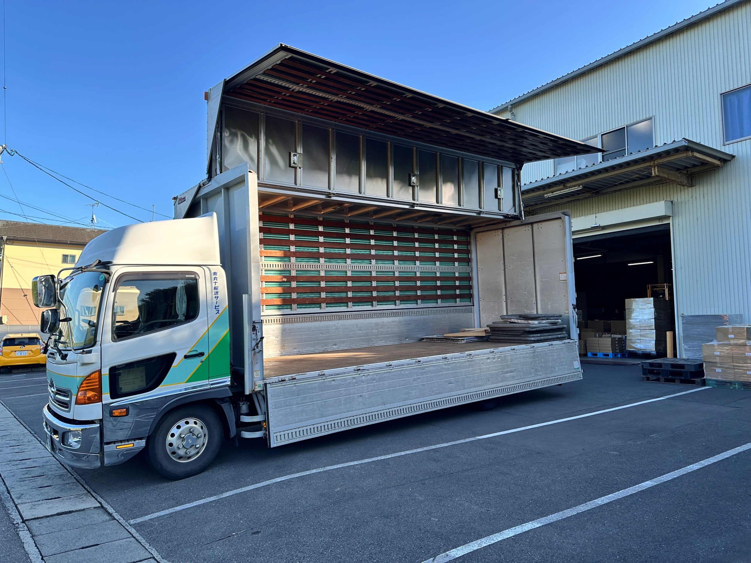 4tウイングのメリットは、荷台側面のアルミパネルを跳ね上げて開けるため、フォークリフトを使った効率的な荷物の積み下ろしができる点です。